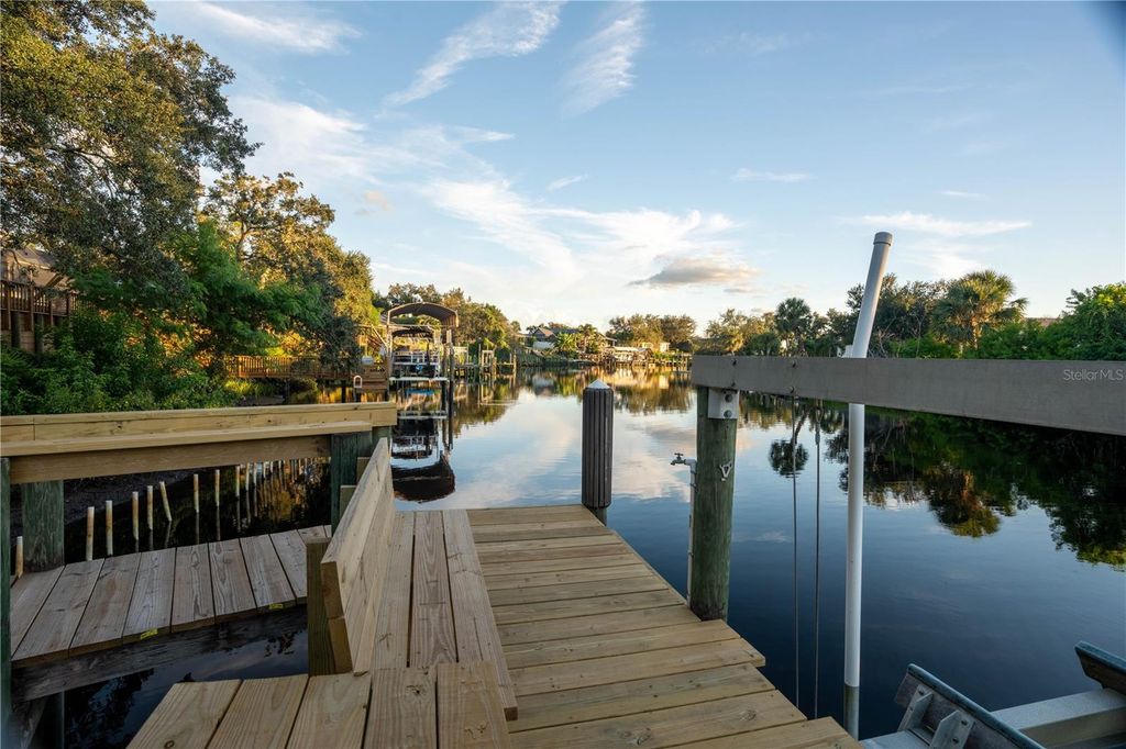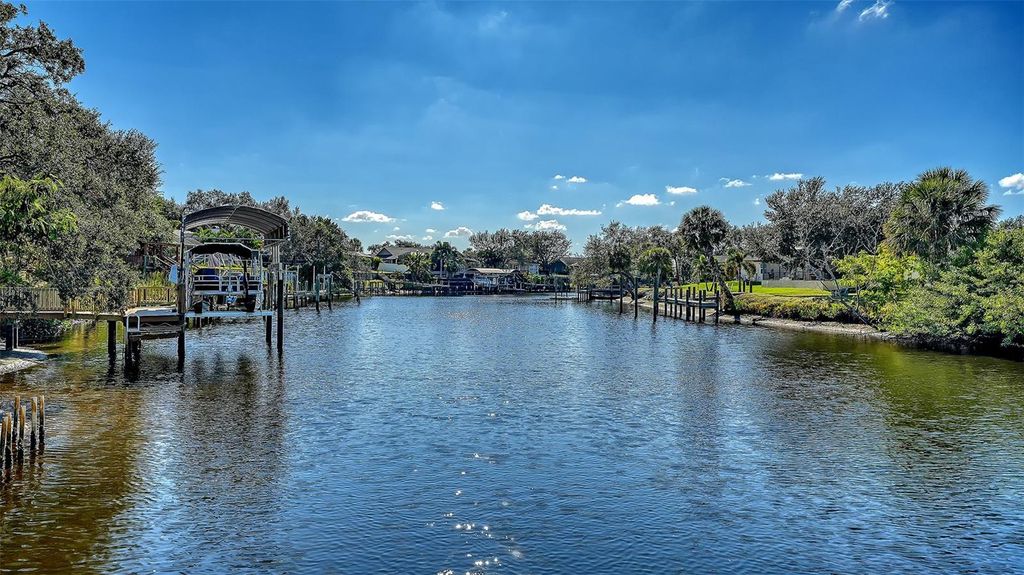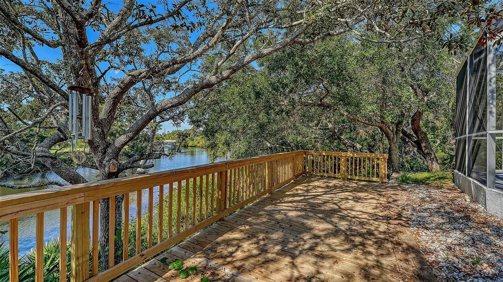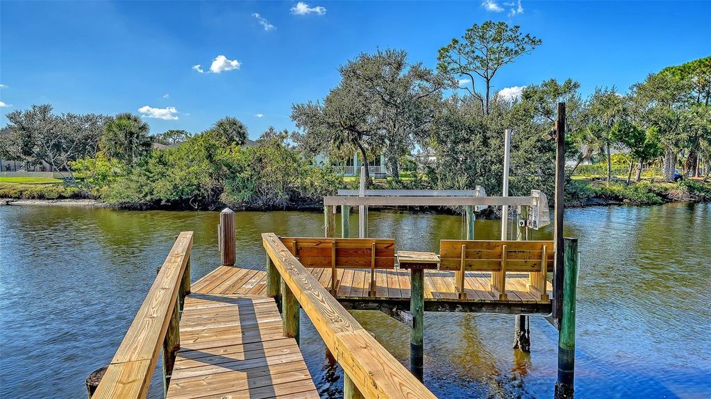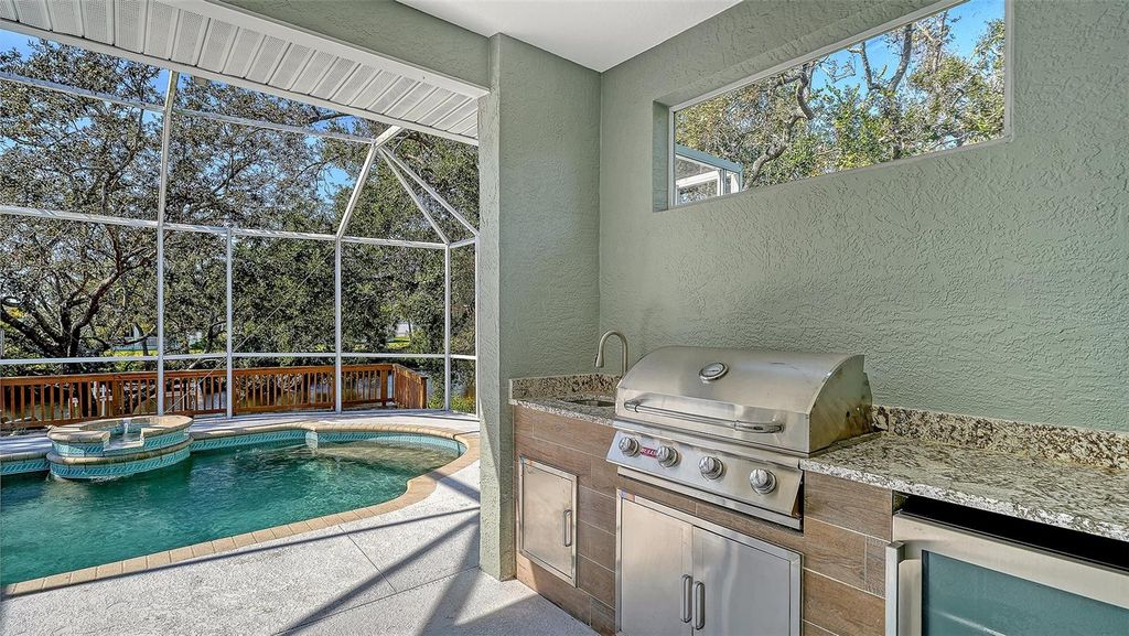 TOTALLY UPDATED POOL HOME WITH BOAT LIFT AND GULF ACCESS. This is your chance to live in a great home on the water without being in a flood zone. This is X flood zone. No flood insurance required. This 3 bedroom 2 bath home has all new LVP flooring, kitchen, bathrooms, appliances, fixtures, trim, paint, outdoor kitchen and paver driveway. All cabinetry is dove tail with soft close feature, and all counters are quartz. The floor plan is spacious, bright and open with high ceilings, huge windows, and a wood burning fireplace that is shared between the family room and the 3rd bedroom or den. The open kitchen is amazing and overlooks the family room. The living room, family room and primary bedroom all have large windows and sliders leading to the screened and covered lanai and pool. The outdoor living space is beautiful and tranquil with an awesome view of your shade trees, dock and river. Enjoy watching the visiting Manatee, jumping Mullet, and rolling Tarpon from your updated dock. After boating for the day, you can lift your boat out of the water, jump in the pool, and cook the catch of the day at your amazing outdoor kitchen. Then have a cocktail and watch a beautiful sunset from your shaded deck. River Landings also has a community pool and dock, and is only a few miles to I-75. Low HOA and no CDD fee. This location is convenient to Lakewood Ranch, UTC Mall, Sarasota, Bradenton, restaurants, shopping, and golf. This home is great for entertaining and enjoying the Florida lifestyle.