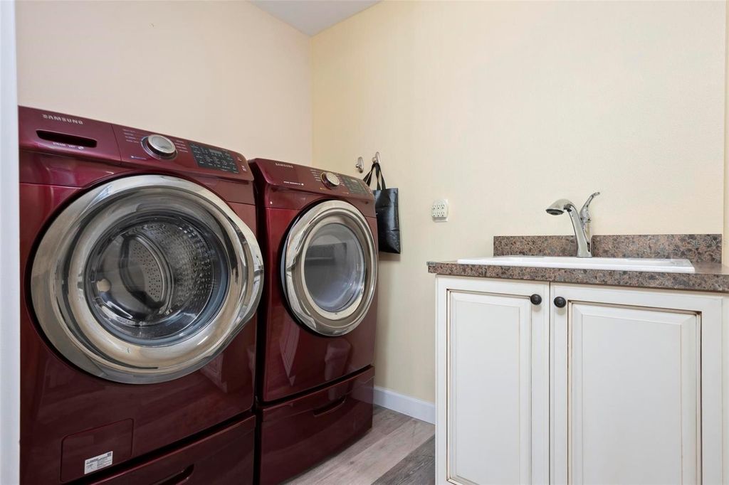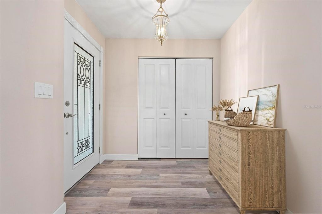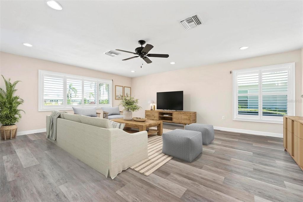 One or more photo(s) has been virtually staged. MOVE IN READY, UPDATED, HURRICANE REINFORCED, FLOOD ZONE X! (No Flood Ins Required) It does not get better than this! Located on a quiet cul-de-sac, this 55+ community of Village Green is appropriately named for its uniquely generous GREEN SPACE right outside your back door, encircling your private community pool & cabana. This beautifully updated 2BR 2Bath home features a large open spacious floor plan with sophisticated finishes, recessed lighting, ceiling fans, plantation shutters, and luxury wood grain vinyl flooring throughout. The custom-designed kitchen is complete with soft close cabinets featuring roll-out shelves, deep drawers, granite countertops, tile backsplash, stainless-steel appliances and a Culligan reverse osmosis system for purified water at the kitchen sink and ice maker. The master bedroom with ensuite offers a unique walk-in custom spa shower. A dedicated laundry room includes a front-load washer and dryer, a utility sink for added convenience and lots of additional space for a personal office or pantry. Built for Florida living, recent upgrades included impact windows and doors supported by additional rolldown and metal panel shutters providing comprehensive storm protection. The oversized two-car garage includes shelf storage and attic storage accessible by drop- down stairs and a 2nd utility sink for convenience. This section of Village Green boasts the lowest HOA fees of all sections. Qtrly HOA fees include landscape and irrigation service as well as basic cable/internet, exterior painting, annual roof cleaning, exterior pest control, pool upkeep, common area taxes, escrow reserve. Centrally located in Bradenton, and under 10 minutes from gulf coast beaches of Anna Maria, shopping and dining, Village Green remains one of the most affordable and well-maintained communities in the area. Schedule your private tour today to make this Village Green gem your own!