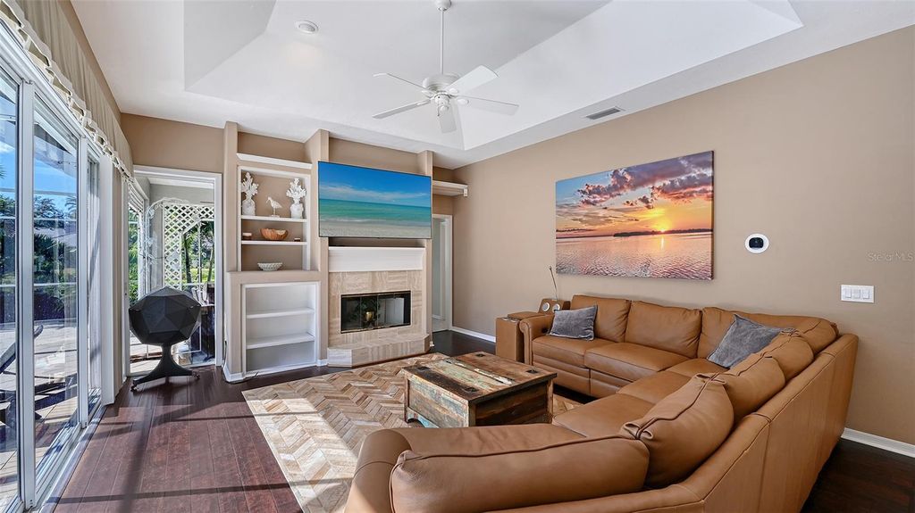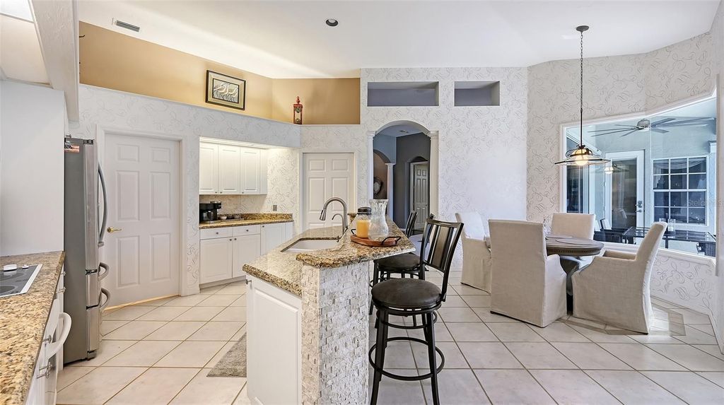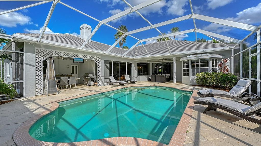 Welcome to this single-story home in the gated community of University Park Country Club, built by respected local builder Todd Johnston. This spacious residence offers 3 bedrooms, an office, and 3 full bathrooms, thoughtfully designed for comfort and easy everyday living. Upon entering by the pavered driveway/walkway with tropical landscaping, you’ll be greeted by soaring high ceilings. The well-thought-out split plan ensures privacy, with 2 guest bedrooms, 2 guest bathrooms and an office with built-ins thoughtfully situated on one side, while the spacious primary suite occupies the opposite wing. The primary suite is a true retreat, featuring new carpet, a generous walk-in closet, and a cozy bright sitting area. Enjoy direct access to the lanai through your private door and indulge in the ensuite bathroom complete with a soaking jetted tub, walk-in shower, dual vanity, and a convenient seated makeup area. The heart of this home is its large kitchen, designed with functionality in mind. It opens seamlessly to a welcoming breakfast nook and a spacious family room, creating an ideal space for gatherings and everyday living. A large walk-in pantry with a desk provides additional convenience and storage. The home’s living areas are enhanced by an aquarium window that offers picturesque views and allows natural light to flood the space. Two large sliders lead out to the pavered lanai, where you’ll find a heated pool and outdoor kitchen, perfect for relaxation and outdoor entertainment. Additional features and upgrades include a BRAND NEW GENERAC WHOLE HOUSE GENERATOR, NEW ROOF in 2021, NEW HVAC in 2022, a climate-controlled wine storage closet in the office and a full wall of built-in storage cabinets in the garage. University Park Country Club is consistently ranked one of the top courses in Florida featuring 27 holes of championship golf; tennis and pickleball; fitness center, croquet – as well as an array of social and group activities. Just a 15-minute drive outside this peaceful enclave is downtown Sarasota, with shopping, arts & theatres, museums, dining and entertainment, top-ranked healthcare, beaches and SRQ International Airport. Two miles east of UPCC is the convenience of I-75, University Town Center with 300 nationally known and homegrown shops, restaurants, fitness studios, services and attractions and the Nate Benderson Park, home of world-class rowing events. Enjoy the club amenities with the required minimum of a Social membership at UPCC, which is owned by the residents through a Recreation District.