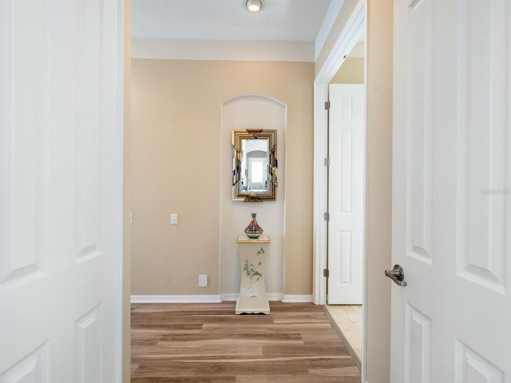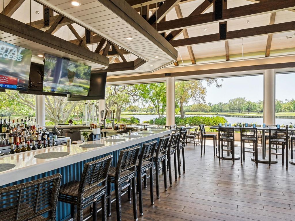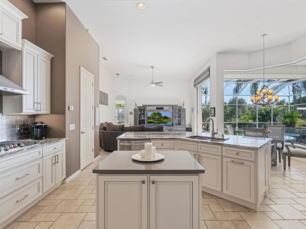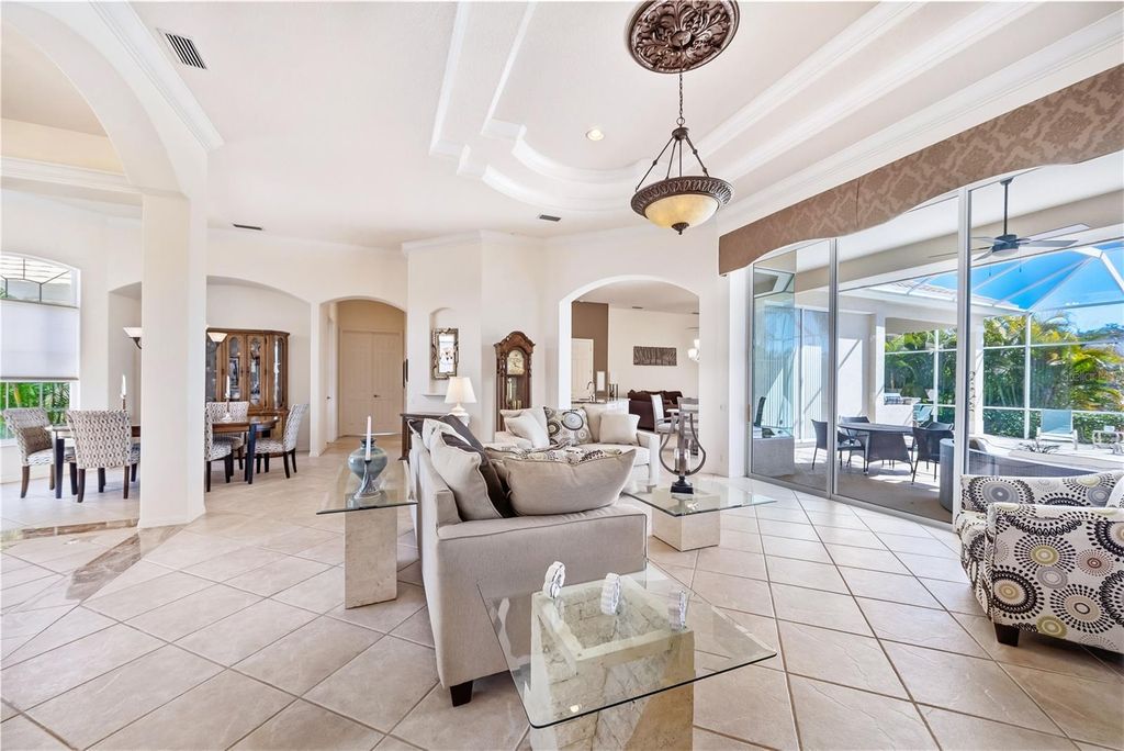 Welcome to this beautifully appointed Neal Custom Homes residence offering serene water views, exceptional architectural detail, and resort-style outdoor living. This 3-bedroom, 3-bath home with an oversized 3-car garage offers 3356 sf and is thoughtfully designed for both everyday comfort and elegant entertaining. A double designer leaded-glass front door opens to a striking foyer with marble inlay flooring, setting the tone for the refined interiors. High-end ceramic tile laid on the diagonal flows throughout the main living areas, complemented by tray and coffered ceiling details, crown molding, custom niches, and recessed lighting. The living room features a triple tray ceiling, an electric fireplace, and pocket sliders that open seamlessly to the lanai. The brand-new kitchen (2021) is the heart of the home, showcasing rich off-white wood cabinetry, exotic granite countertops, a quartz-topped center island, GE stainless steel appliances, subway tile backsplash, under-cabinet lighting, a spacious pantry, built-in oven with microwave, and an aquarium window in the breakfast area. Open to the family room and lanai, this space is ideal for entertaining. The primary suite is a private retreat featuring a sitting area with bay-style windows, coffered ceiling, dual customized closets, double-door entry, and private access to the lanai. The spa-inspired, wheelchair-accessible primary bath offers an oversized marble-detailed shower, Jacuzzi tub, marble flooring, expansive double vanity with makeup area, cultured marble countertops, triple mirrors, and new designer hardware. Bedroom two is a generously sized custom suite with a large closet and bath featuring a cultured marble vanity and tub/shower combination. Bedroom three is adjacent to a full hall bath with enclosed shower, linen closet, and updated brushed-silver fixtures. A large rear den with cathedral-style ceiling and sliders to the lanai can easily serve as a fourth bedroom with the addition of a closet. Step outside to your private oasis with a kidney-shaped heated pool and spa, lush updated landscaping with lighting, and a covered lanai offering space for a future outdoor kitchen (currently equipped with refrigerator and cabinetry). The oversized 3-car garage features higher ceilings, a painted floor, storage cabinetry, exterior access, and an electric hydraulic car lift, perfect for car enthusiasts. Additional highlights include central vacuum, exquisite lighting, select new fans, window treatments, brushed-silver hardware throughout, and a well-appointed laundry room with cabinetry, sink, and built-in ironing board. Available furnishings may be purchased separately.