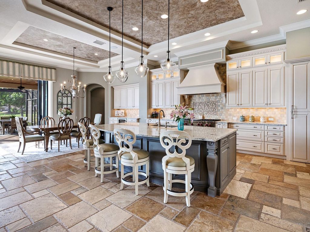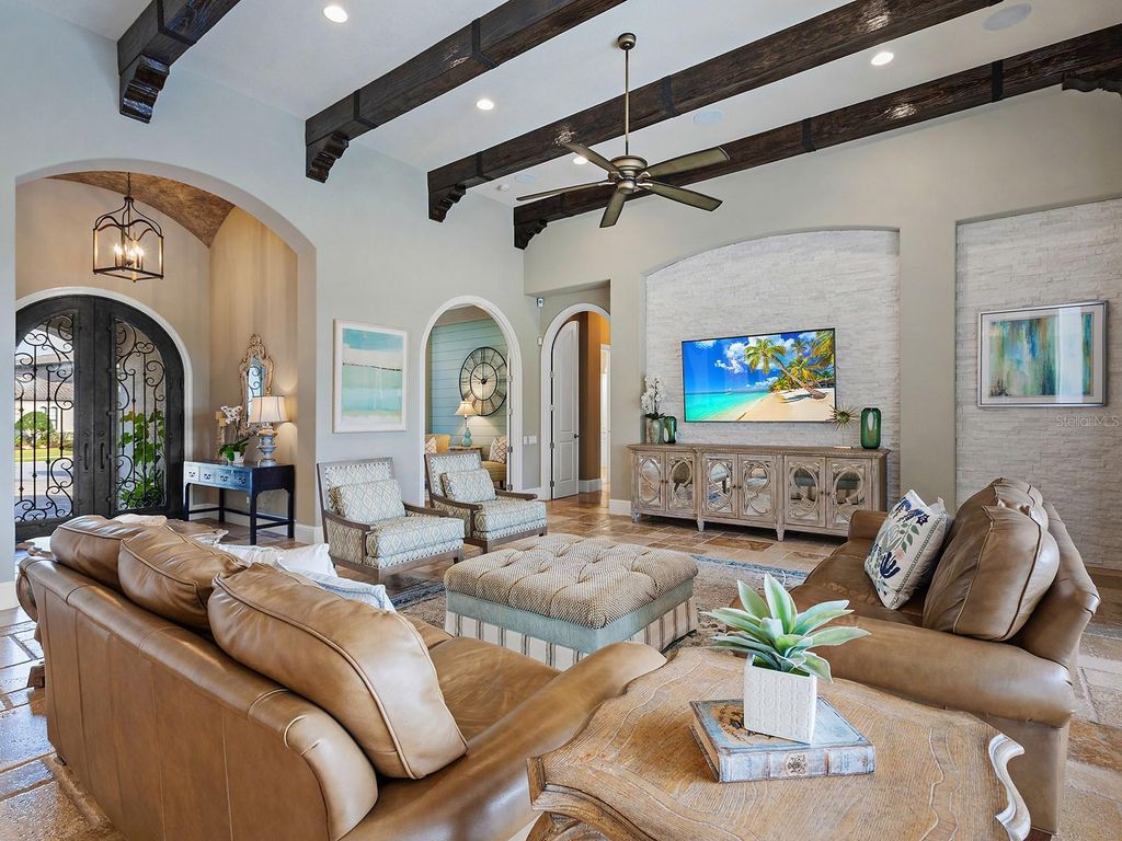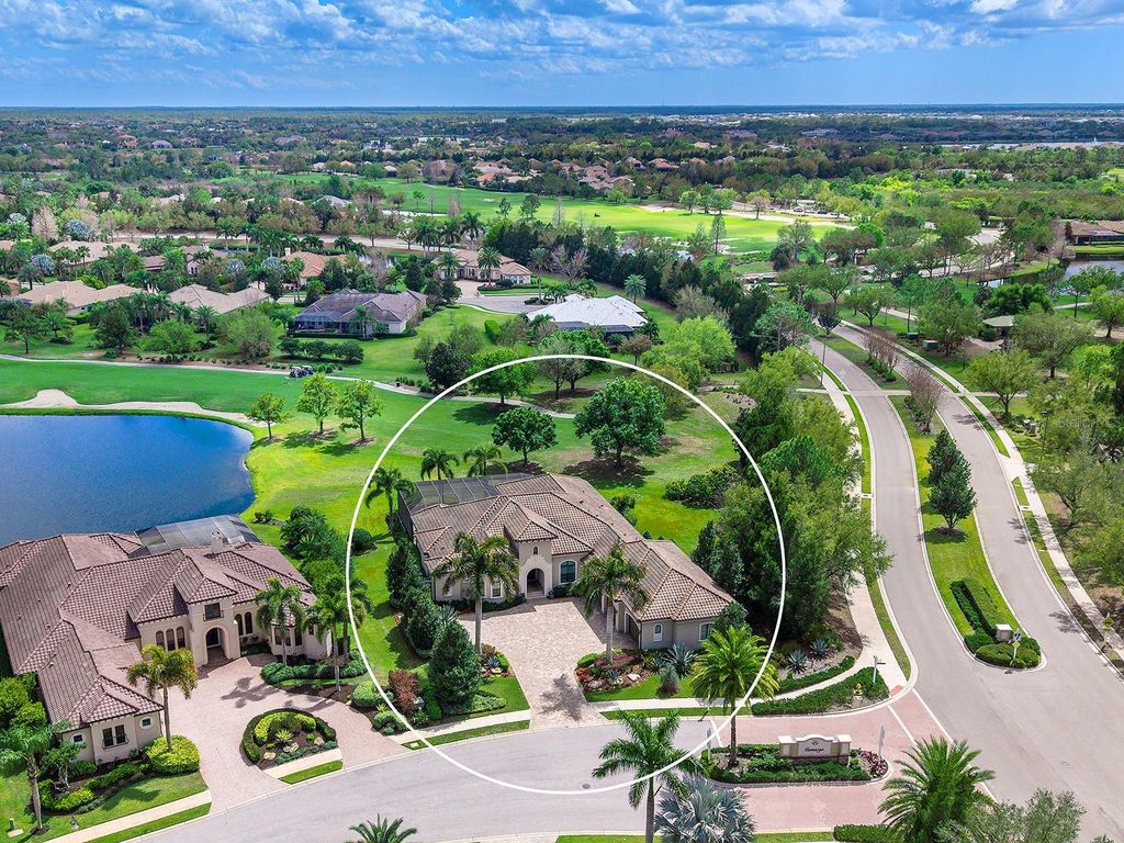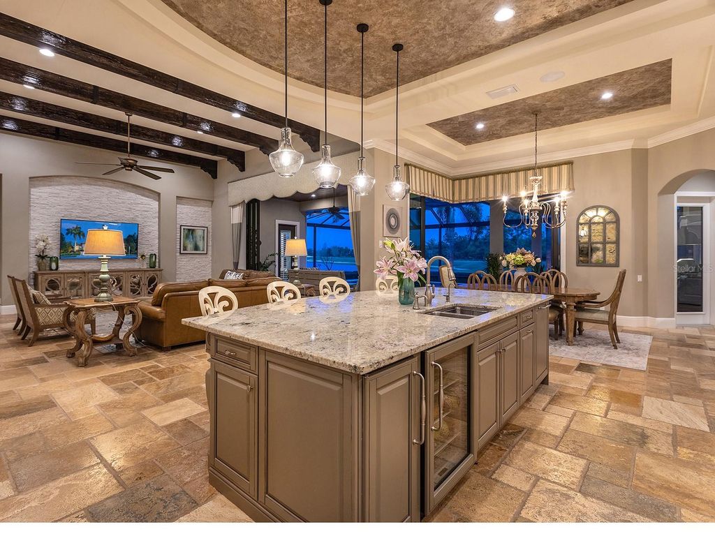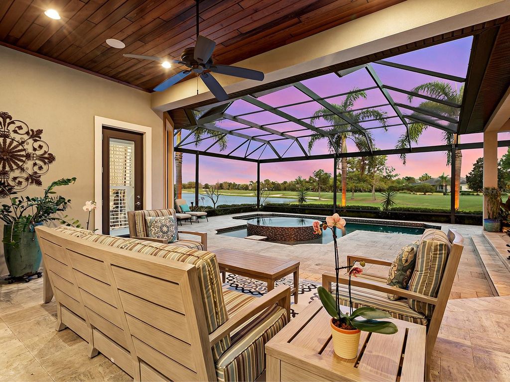 Set within the gates of Country Club East, this highly customized, green-certified residence is distinguished by its architectural details and elevated finishes. Mature landscaping frames the home, complemented by lighting, an expansive side yard, and a paver driveway. Inside, the home establishes a sense of craftsmanship and scale. A striking entry with tongue-and-groove ceiling detail and arched iron double doors opens to a cathedral-ceiling foyer, where architectural archways guide the transition into the main living spaces. Throughout the home, upgrades such as solid wood arched doors, crown molding, 7-inch baseboards, Icynene spray foam insulation, and a blend of stone flooring with Dura Shield coating and engineered wood create both visual continuity and performance-driven comfort. The great room is designed with soaring 14-foot ceilings accented by faux wood beams and a recessed media wall with stacked stone detailing. Sliding glass doors open fully to the lanai, drawing in natural light and framing unobstructed views of the pool, lake, and golf course beyond. The kitchen and dining areas strike a balance between functionality and style. Custom cabinetry with glass-front uppers and integrated LED lighting pairs with a full suite of Sub-Zero and Wolf appliances, including a wine cooler and additional refrigeration. A vast floating island with hidden outlets and storage anchors the space, while a walk-in pantry with wood shelving and thoughtful details, such as spice pull-outs and concealed trash storage, enhances everyday usability. Adjacent dining spaces are elevated by layered ceiling treatments, designer lighting, and zero-corner sliders that emphasize the indoor-outdoor lifestyle. A detailed office offers dual workstations, extensive built-ins, a circular tray ceiling with intricate woodwork, and shiplap accent detailing. The primary suite is privately positioned, featuring tray ceilings with cove lighting, a sitting area, lanai access, and dual custom walk-in closets. The spa-like bath includes a Kohler soaking tub with stone surround, two vanities, and a walk-in shower with multiple showerheads, travertine finishes, and architectural window detailing. Three guest suites are equally refined, offering spacious closets, plantation shutters, and access to well-appointed bathrooms featuring custom tilework, granite surfaces, and a shower and/or tub. A standout bonus space, currently configured as a golf simulator room, features a barrel-vaulted ceiling, professional-grade flooring, and direct lanai access. The outdoor living experience is designed as a private resort setting. The lanai features a tongue-and-groove ceiling, recessed lighting, and multiple seating areas overlooking a saltwater pool and spa, complete with iridescent tile and a sun shelf. A fully equipped outdoor kitchen boasts Monogram appliances, marine-grade cabinetry, and granite countertops, all set against tranquil views of the golf course and water. Functionality is further enhanced by a well-equipped laundry room, a thoughtfully designed drop zone and mudroom entry from the garage, and extensive storage throughout. The oversized garage, which holds 6 cars, is equipped with epoxy flooring, built-in cabinetry, overhead storage, a utility sink, and a 7,000lb car lift. Ideally located in Lakewood Ranch, residents are just minutes from Waterside Place, UTC shopping and dining, Nathan Benderson Park, SRQ Airport, downtown Sarasota, and the renowned Gulf beaches.