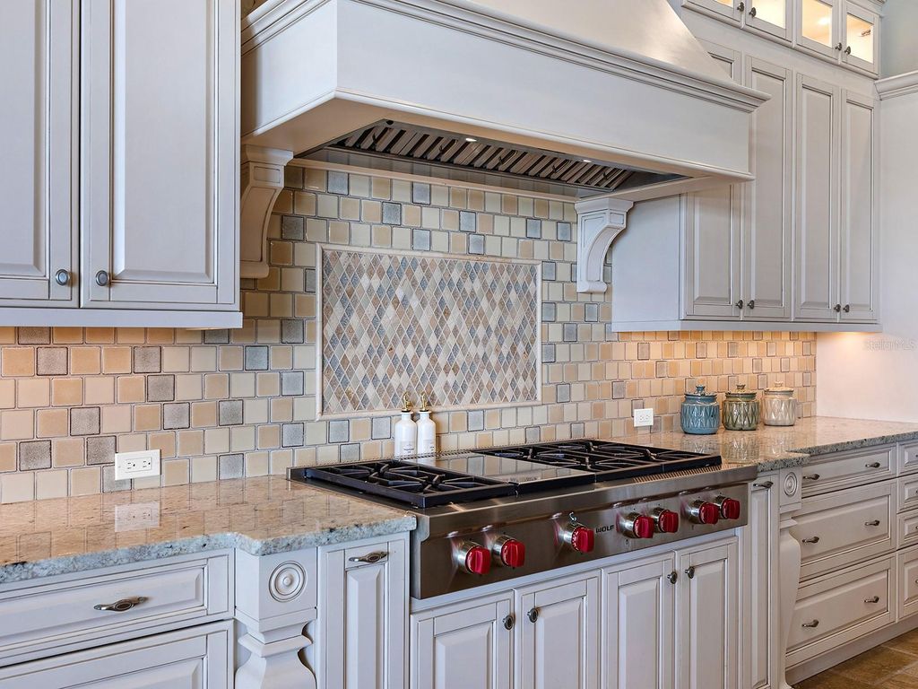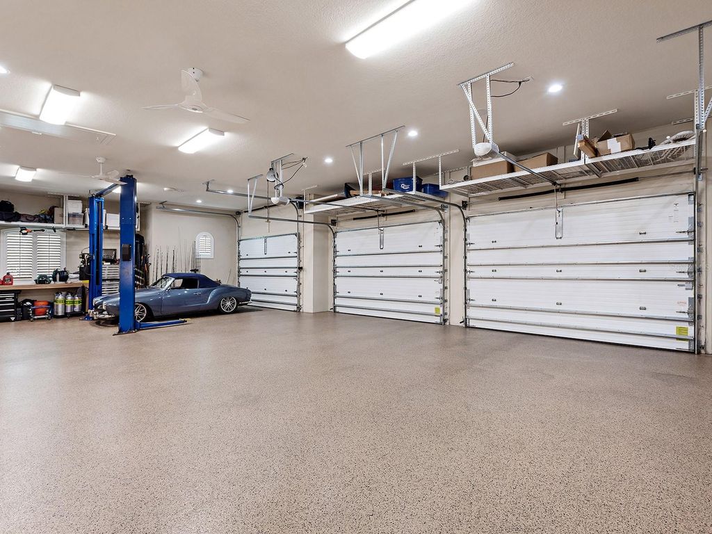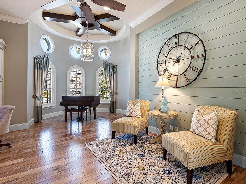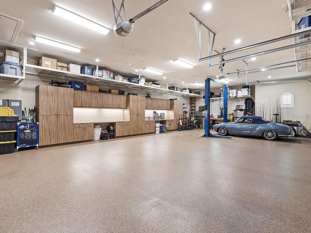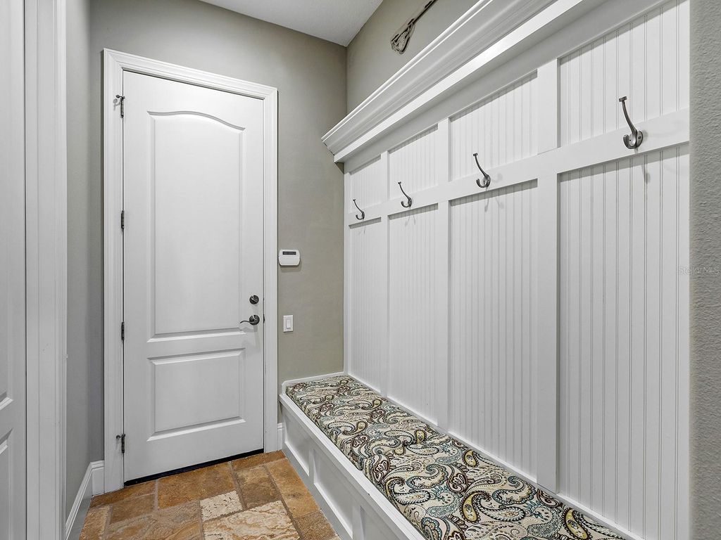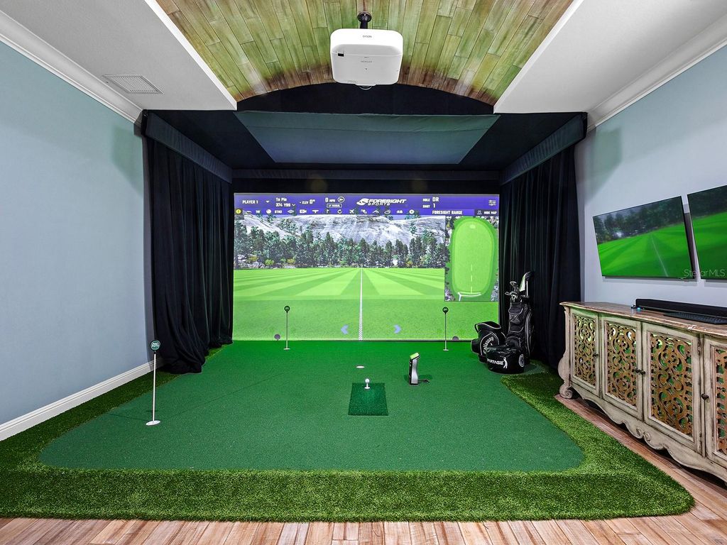 Set within the gates of Country Club East, this highly customized, green-certified residence is distinguished by its architectural details and elevated finishes. Mature landscaping frames the home, complemented by lighting, an expansive side yard, and a paver driveway. Inside, the home establishes a sense of craftsmanship and scale. A striking entry with tongue-and-groove ceiling detail and arched iron double doors opens to a cathedral-ceiling foyer, where architectural archways guide the transition into the main living spaces. Throughout the home, upgrades such as solid wood arched doors, crown molding, 7-inch baseboards, Icynene spray foam insulation, and a blend of stone flooring with Dura Shield coating and engineered wood create both visual continuity and performance-driven comfort. The great room is designed with soaring 14-foot ceilings accented by faux wood beams and a recessed media wall with stacked stone detailing. Sliding glass doors open fully to the lanai, drawing in natural light and framing unobstructed views of the pool, lake, and golf course beyond. The kitchen and dining areas strike a balance between functionality and style. Custom cabinetry with glass-front uppers and integrated LED lighting pairs with a full suite of Sub-Zero and Wolf appliances, including a wine cooler and additional refrigeration. A vast floating island with hidden outlets and storage anchors the space, while a walk-in pantry with wood shelving and thoughtful details, such as spice pull-outs and concealed trash storage, enhances everyday usability. Adjacent dining spaces are elevated by layered ceiling treatments, designer lighting, and zero-corner sliders that emphasize the indoor-outdoor lifestyle. A detailed office offers dual workstations, extensive built-ins, a circular tray ceiling with intricate woodwork, and shiplap accent detailing. The primary suite is privately positioned, featuring tray ceilings with cove lighting, a sitting area, lanai access, and dual custom walk-in closets. The spa-like bath includes a Kohler soaking tub with stone surround, two vanities, and a walk-in shower with multiple showerheads, travertine finishes, and architectural window detailing. Three guest suites are equally refined, offering spacious closets, plantation shutters, and access to well-appointed bathrooms featuring custom tilework, granite surfaces, and a shower and/or tub. A standout bonus space, currently configured as a golf simulator room, features a barrel-vaulted ceiling, professional-grade flooring, and direct lanai access. The outdoor living experience is designed as a private resort setting. The lanai features a tongue-and-groove ceiling, recessed lighting, and multiple seating areas overlooking a saltwater pool and spa, complete with iridescent tile and a sun shelf. A fully equipped outdoor kitchen boasts Monogram appliances, marine-grade cabinetry, and granite countertops, all set against tranquil views of the golf course and water. Functionality is further enhanced by a well-equipped laundry room, a thoughtfully designed drop zone and mudroom entry from the garage, and extensive storage throughout. The oversized garage, which holds 6 cars, is equipped with epoxy flooring, built-in cabinetry, overhead storage, a utility sink, and a 7,000lb car lift. Ideally located in Lakewood Ranch, residents are just minutes from Waterside Place, UTC shopping and dining, Nathan Benderson Park, SRQ Airport, downtown Sarasota, and the renowned Gulf beaches.