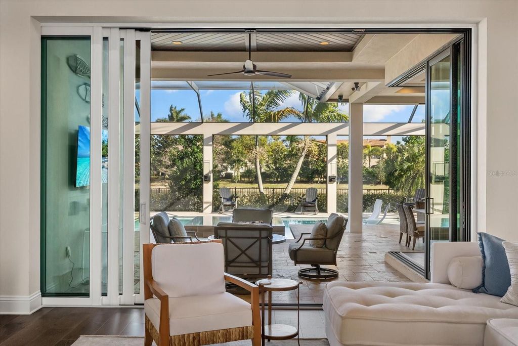 Set on a premium .3-acre waterfront homesite with expansive lake views, this exceptional Lee Wetherington-built residence offers nearly 3,000 square feet of thoughtfully curated living space where custom craftsmanship and attention to detail define every room. With 3 bedrooms, 3.5 baths and a den, this home is a true showcase of architectural design, elevated finishes, and refined Florida living. From the moment you arrive, the paver driveway, lush landscaping, and courtyard-style entry set the tone for what awaits inside. Wide-plank white oak flooring flows throughout the main living areas, complemented by intricate coffered ceilings, crown molding, custom millwork, designer feature walls, statement lighting, and tailored built-ins that elevate the space beyond the expected. The gourmet kitchen is both striking and functional, anchored by an oversized quartz island and surrounded by custom cabinetry, glass display accents, designer backsplash, and premium appliances including a Wolf gas cooktop and Sub-Zero refrigerator. The open-concept layout flows seamlessly into the great room and dining space, where architectural ceiling details and pocketing sliders frame the stunning water views.The primary suite offers a serene retreat with water views, direct lanai access, custom-designed walk-in closets, a coffee/beverage nook, and a spa-inspired bath featuring dual vanities, an oversized walk-in shower, and a freestanding soaking tub. Each guest bedroom includes its own en-suite bath, thoughtfully appointed with quality finishes and custom touches. A beautifully designed den provides flexible space for a home office or additional lounge. In addition, there is a built-in work area with a desk and cabinets just outside the two guest bedrooms. Perfectly positioned to capture expansive water views, the outdoor living environment is a true focal point of this home. The screened lanai features a heated, salt water pool and raised spa, travertine decking, a fully equipped outdoor kitchen, and multiple covered areas designed for both intimate evenings and larger gatherings. In addition, a recently installed fence creates a safe space for pets. Other notable features and upgrades include a new AC (2025), new tankless hot water heater (2026), Control4 smart home and security system, and water softener. Built with the superior quality Lee Wetherington is known for, this residence is more than just a waterfront home — it is a carefully crafted statement of custom detail, architectural beauty, and luxury lifestyle in Lakewood Ranch. Located within the Matera section of The Lake Club, HOA fees include lawn maintenance and pool service, allowing for a truly maintenance-free lifestyle. Life at The Lake Club extends well beyond the home itself. The clubhouse serves as the social heart of the community, offering sophisticated indoor and outdoor dining venues, and beautifully appointed gathering spaces. Residents enjoy access to a resort-style pool, fitness center, tennis and pickleball courts, scenic walking paths, and a curated calendar of social events designed to foster connection and lifestyle.