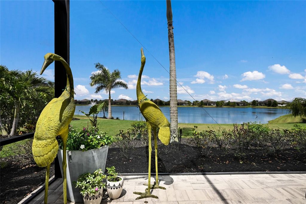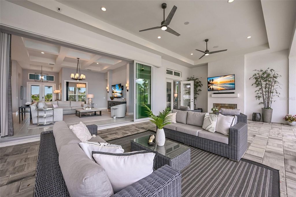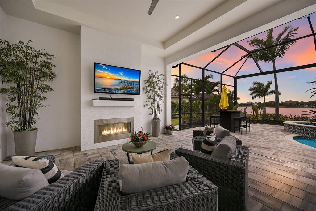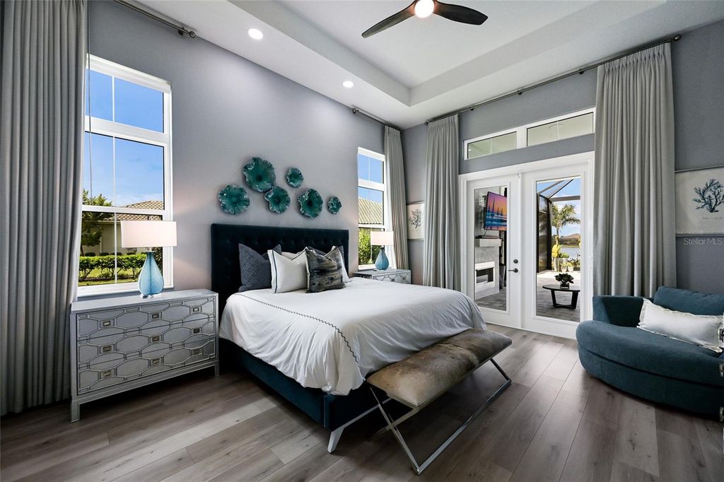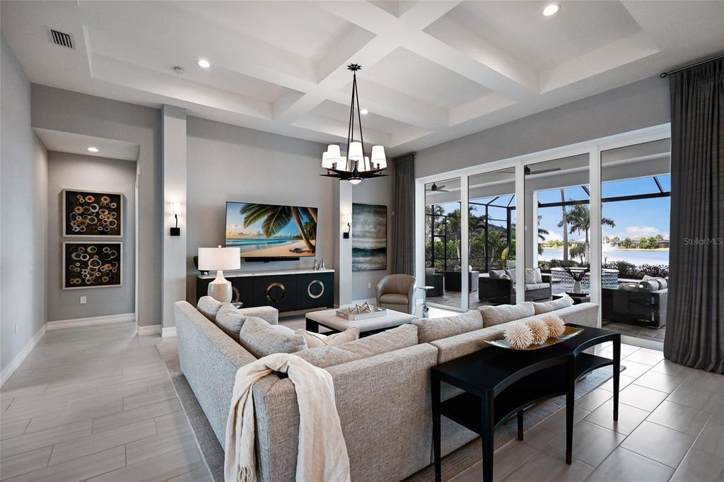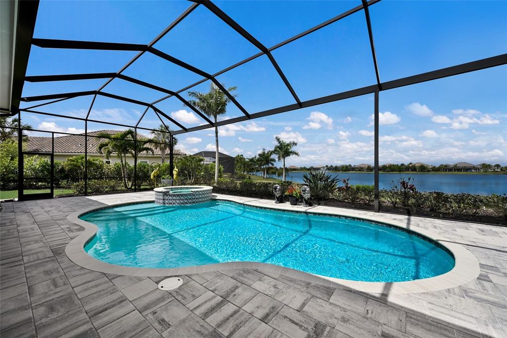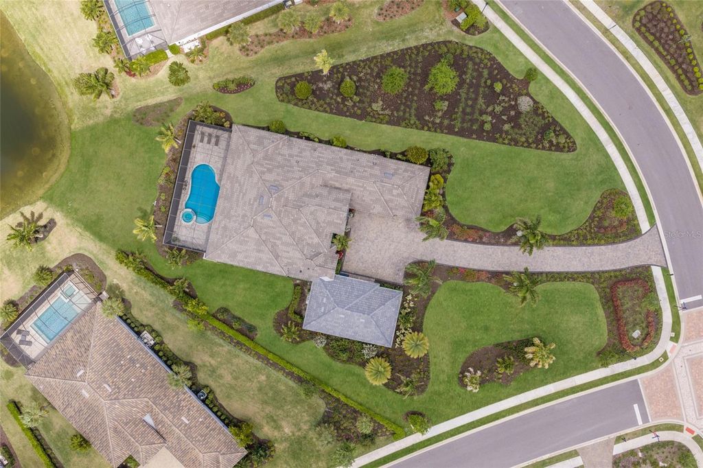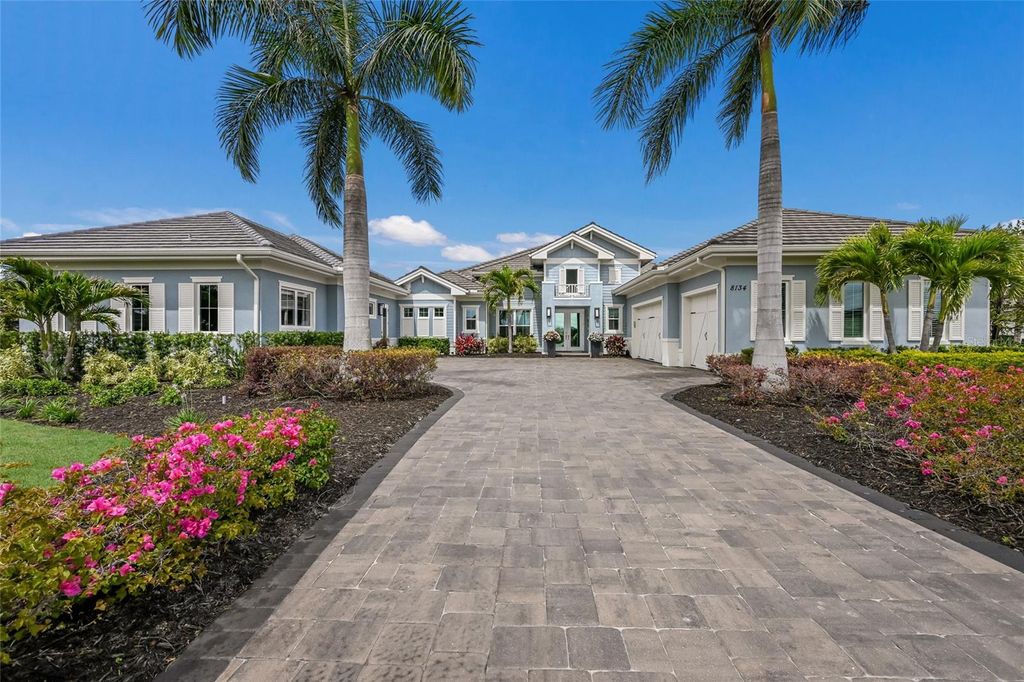 Positioned on one acre inside the exclusive gated community of The Lake Club with breathtaking lakefront westerly views, herein lies an unparalleled opportunity in this 3,734 square foot residence that uniquely offers the recent addition of a magnificent GUEST HOUSE. Added in 2024, the newly built separate entry living quarters offers two bedrooms, two full bathrooms, great room, den and its own kitchenette complete with microwave, refrigerator drawers, freezer and dishwasher. Meanwhile, the main house is a stylishly open one-story plan that exudes thoughtfully planned living spaces, accentuated volume ceilings, skillfully selected finishes, and, of course, all IMPACT windows/doors/sliders. The expansive outdoor retreat elevates the Florida living experience with a panoramic screened lanai, extensive open and under cover spaces, soaring ceilings, full summer kitchen, PebbleTec heated saltwater pool/spa, and an inviting gas fireplace. Ten foot impact disappearing glass sliders seamlessly connect the outdoor oasis to a luxuriantly welcoming great room, dining area and gourmet kitchen crowned with coffered ceiling, accent wall, and designer light fixtures creating a sophisticated open continuity of space. Off the dining room, the gourmet kitchen further accentuates with wood cabinetry, soft-close dove-tail drawers, newly installed quartz counters and backsplash, stainless steel appliances, wine fridge, and walk-in pantry. Relax and unwind in the owner’s quarters positioned on a private wing, offering double tray ceilings, large scale windows, direct lanai access, two oversized walk-in customized closets, and a luxuriously appointed bath with dual station vanity, an oversized shower with designer tile, a large soaking tub, and separate water closet. There are two additional guest suites in the main house, each on a separate wings of the home generous in size with luxury plank vinyl flooring, one offering an ensuite full bath, while the third guest room is just off the home’s pool bath bath. The residence also offers an impressive office behind double-entry doors just off the entry foyer. Other notable highlights of this newly built all-encompassing 5,585 total square foot residence includes a brilliantly finished laundry room with cabinetry and sink, tankless water heater, all impact windows and doors, smarthome automation, and an oversized three car air-conditioned garage with epoxy flooring and storage. This rare offering beckons a lifestyle fulfilled in The Lake Club, where residents enjoy access to a wealth of amenities, including two resort-style heated pools, Grande Clubhouse with fine dining and bar area, a fitness center, spa, tennis courts, pickleball, a playground, dog park, and services of a full-time concierge and activities director.