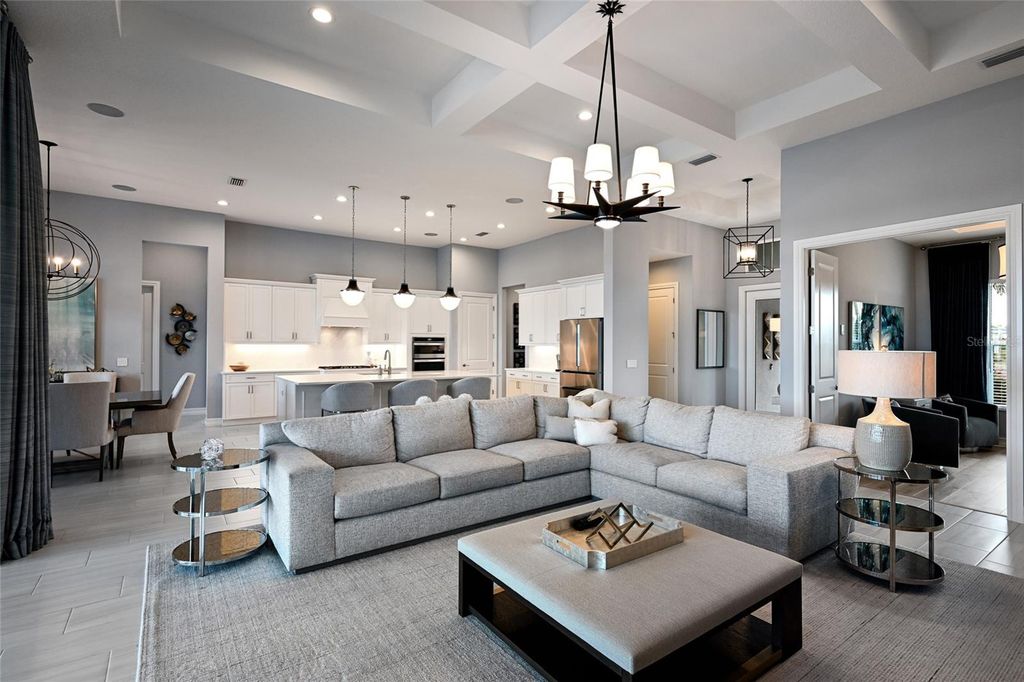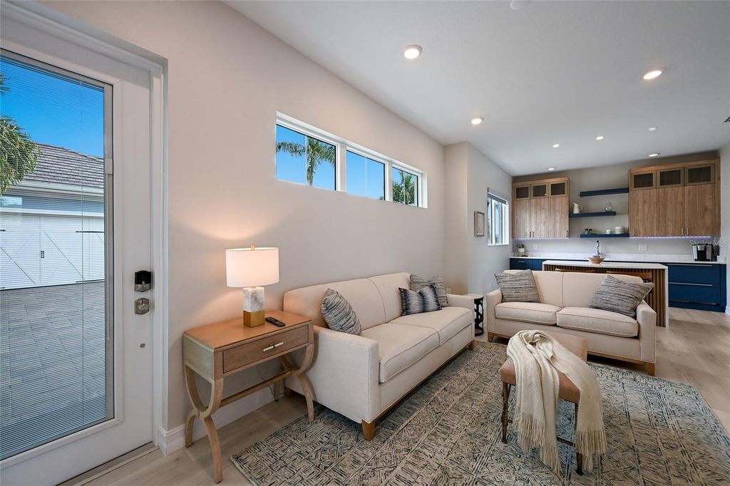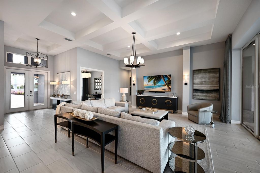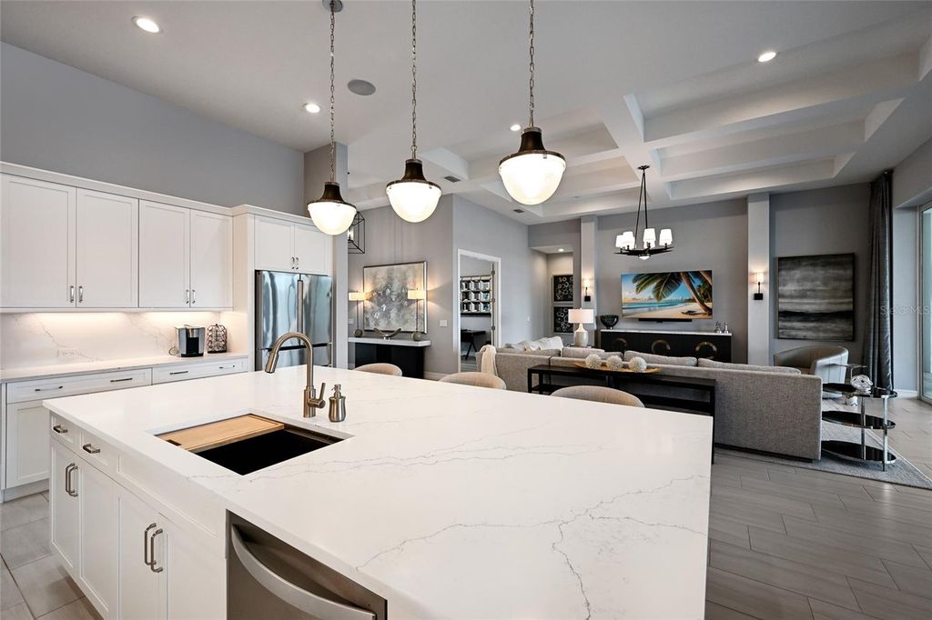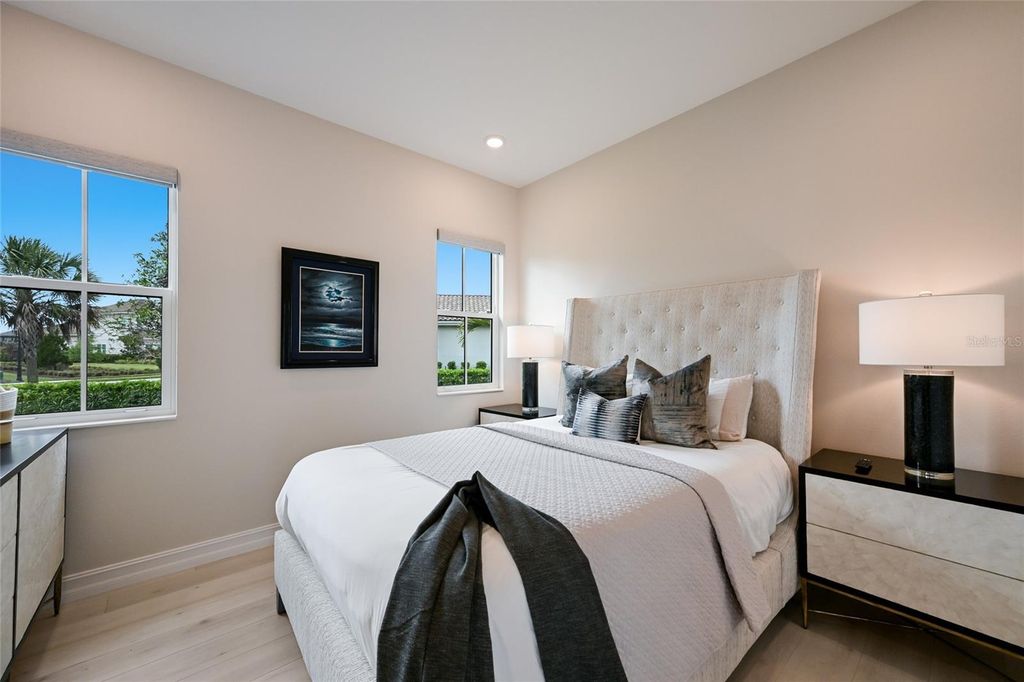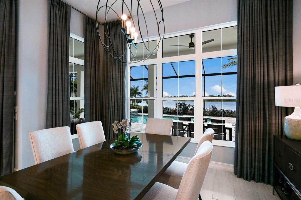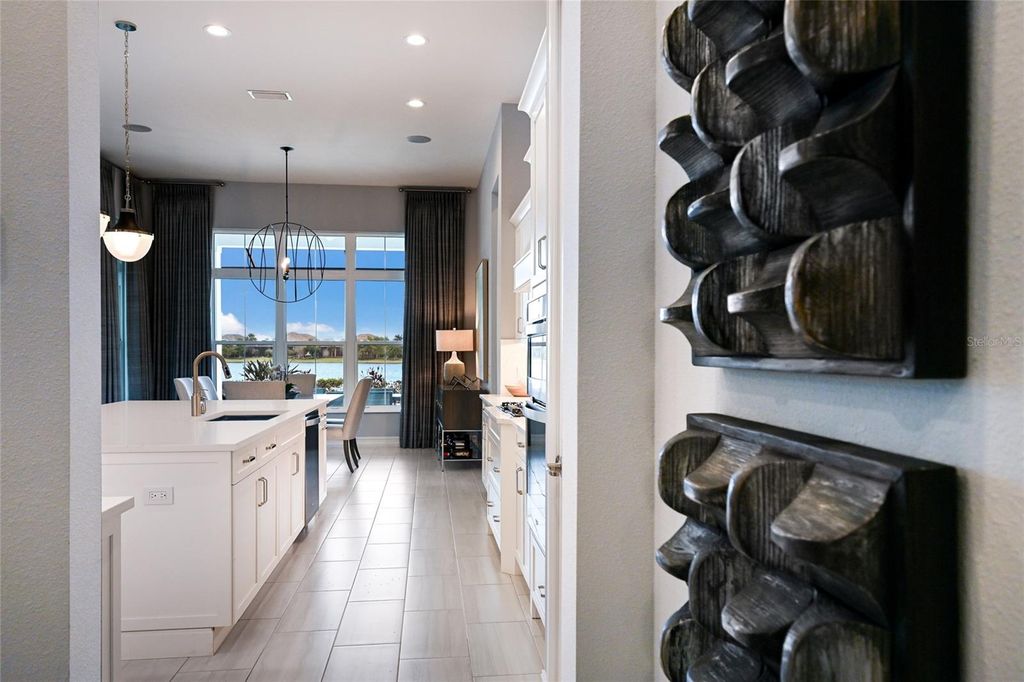 Positioned on one acre inside the exclusive gated community of The Lake Club with breathtaking lakefront westerly views, herein lies an unparalleled opportunity in this 3,734 square foot residence that uniquely offers the recent addition of a magnificent GUEST HOUSE. Added in 2024, the newly built separate entry living quarters offers two bedrooms, two full bathrooms, great room, den and its own kitchenette complete with microwave, refrigerator drawers, freezer and dishwasher. Meanwhile, the main house is a stylishly open one-story plan that exudes thoughtfully planned living spaces, accentuated volume ceilings, skillfully selected finishes, and, of course, all IMPACT windows/doors/sliders. The expansive outdoor retreat elevates the Florida living experience with a panoramic screened lanai, extensive open and under cover spaces, soaring ceilings, full summer kitchen, PebbleTec heated saltwater pool/spa, and an inviting gas fireplace. Ten foot impact disappearing glass sliders seamlessly connect the outdoor oasis to a luxuriantly welcoming great room, dining area and gourmet kitchen crowned with coffered ceiling, accent wall, and designer light fixtures creating a sophisticated open continuity of space. Off the dining room, the gourmet kitchen further accentuates with wood cabinetry, soft-close dove-tail drawers, newly installed quartz counters and backsplash, stainless steel appliances, wine fridge, and walk-in pantry. Relax and unwind in the owner’s quarters positioned on a private wing, offering double tray ceilings, large scale windows, direct lanai access, two oversized walk-in customized closets, and a luxuriously appointed bath with dual station vanity, an oversized shower with designer tile, a large soaking tub, and separate water closet. There are two additional guest suites in the main house, each on a separate wings of the home generous in size with luxury plank vinyl flooring, one offering an ensuite full bath, while the third guest room is just off the home’s pool bath bath. The residence also offers an impressive office behind double-entry doors just off the entry foyer. Other notable highlights of this newly built all-encompassing 5,585 total square foot residence includes a brilliantly finished laundry room with cabinetry and sink, tankless water heater, all impact windows and doors, smarthome automation, and an oversized three car air-conditioned garage with epoxy flooring and storage. This rare offering beckons a lifestyle fulfilled in The Lake Club, where residents enjoy access to a wealth of amenities, including two resort-style heated pools, Grande Clubhouse with fine dining and bar area, a fitness center, spa, tennis courts, pickleball, a playground, dog park, and services of a full-time concierge and activities director.