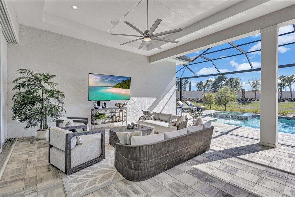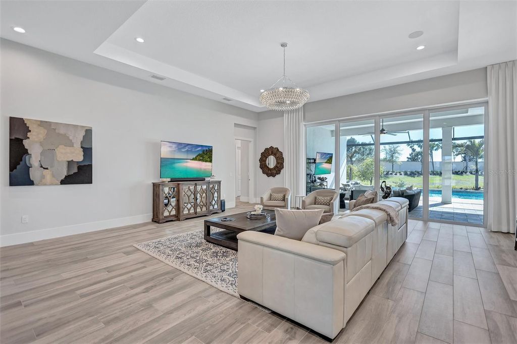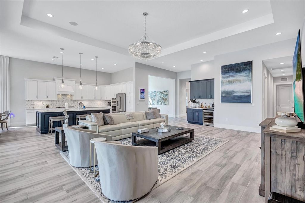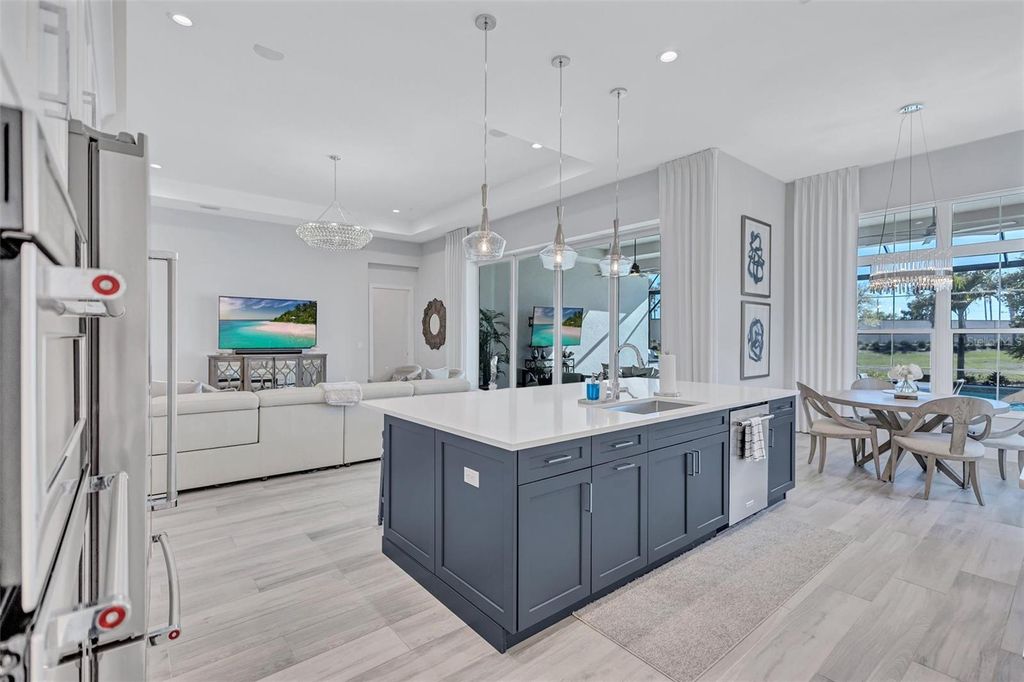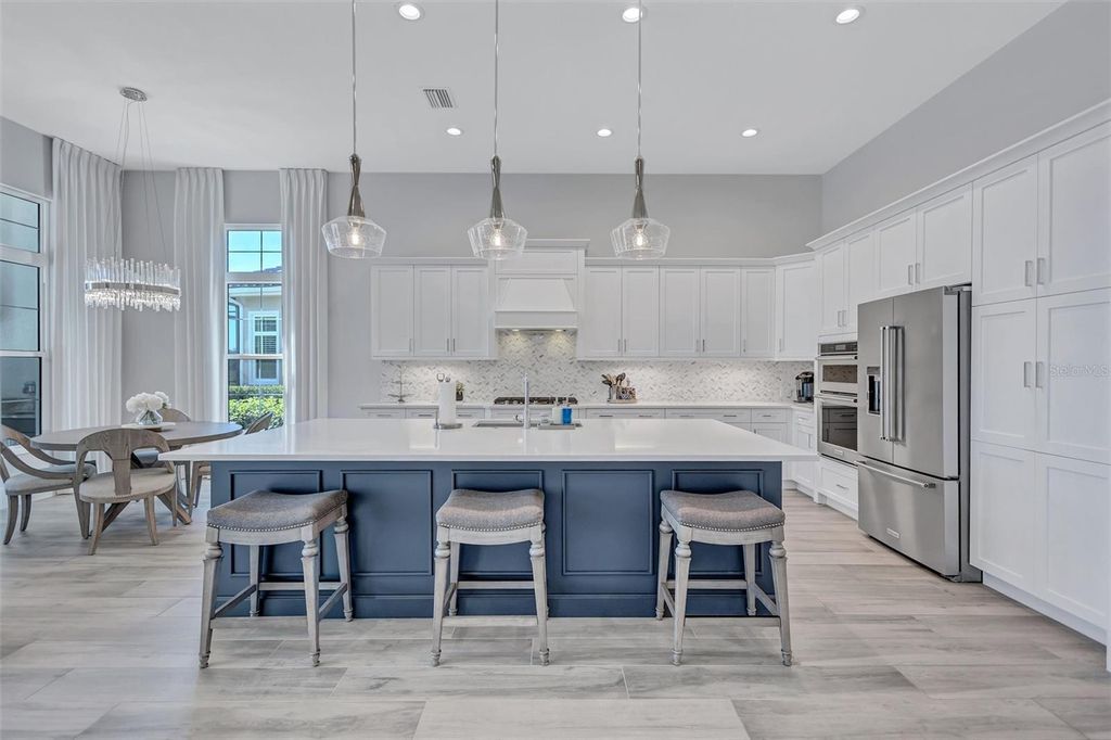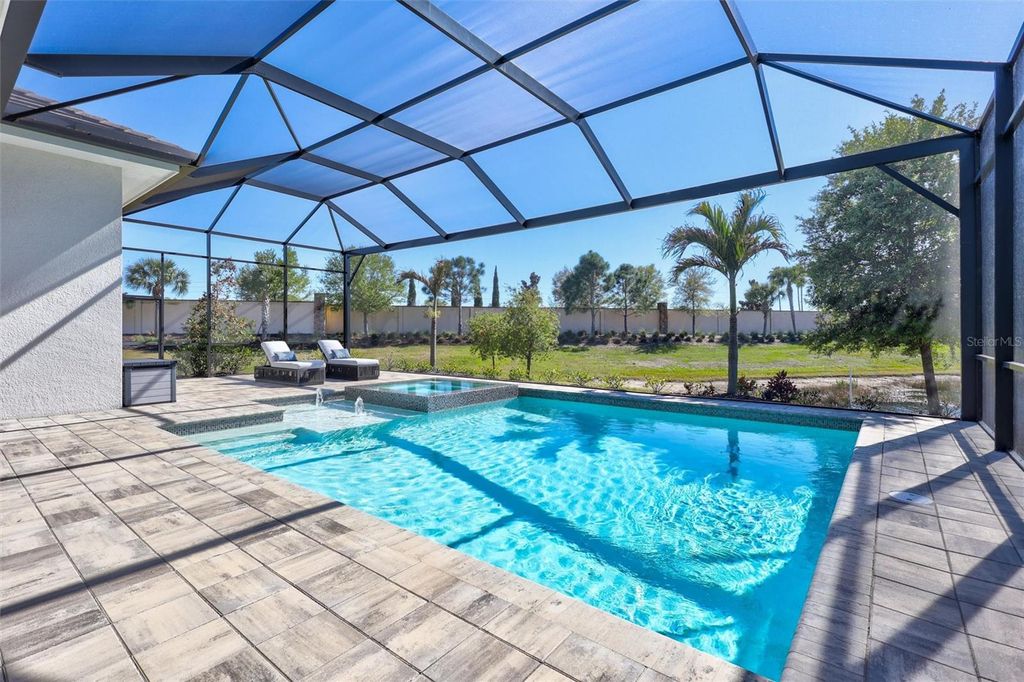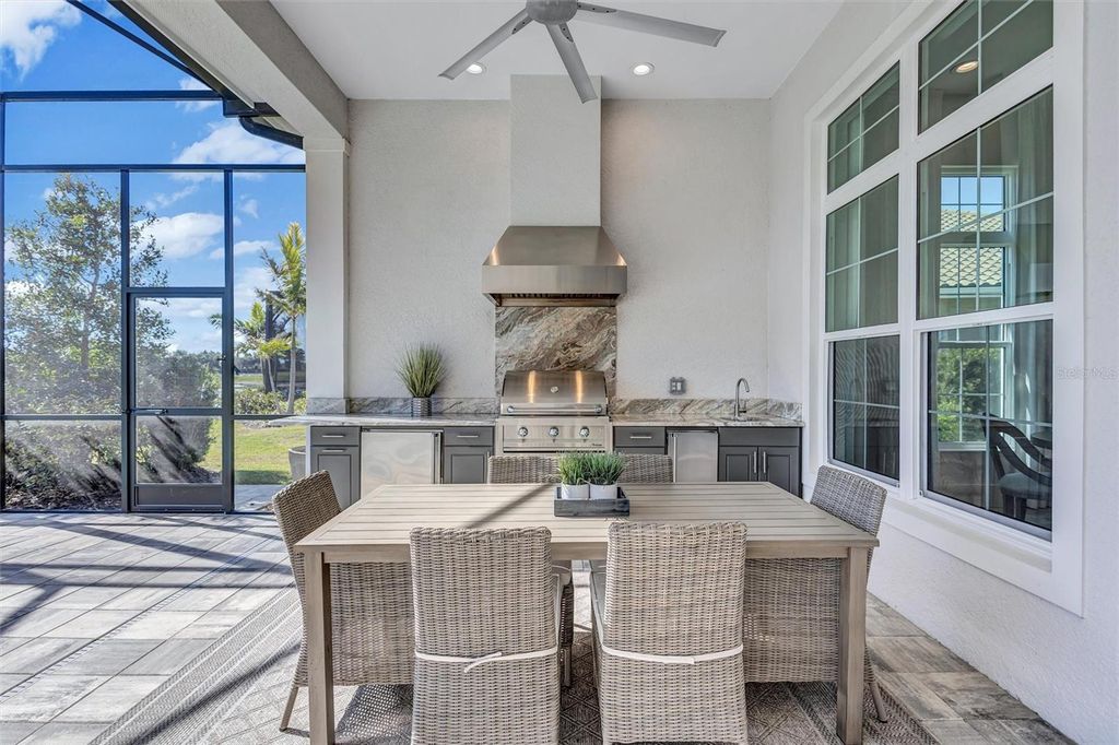 Experience refined Florida living in this beautifully appointed residence within the renowned Lake Club, where comfort, style, and thoughtful design come together in one of Lakewood Ranch’s most sought-after communities. Ideally positioned on a premium water-view homesite, this 2022-built home captures tranquil pond sunsets from its generously sized covered lanai, complete with an expansive, panoramic screened enclosure, finished ceilings, and a fully equipped summer kitchen. Spanning just under 3,000 square feet, the home features an open-concept great room enhanced by soaring ceilings and elegant porcelain plank tile flooring throughout the main living areas. The chef’s kitchen is both functional and stylish, complete with quartz countertops, soft-close cabinetry with pull-out shelving, and a suite of stainless steel appliances, including a gas cooktop and convection oven. Thoughtful enhancements include professionally installed landscape lighting in both the front and rear of the home, as well as a custom outdoor kitchen and smart home upgrades, including a fully automated AV system. Additional interior features include impact-rated windows and doors and upgraded lighting throughout, creating a polished, move-in-ready environment. The spacious primary suite offers a relaxing retreat with a spa-inspired bathroom featuring dual vanities, a walk-in shower, and a freestanding soaking tub. Step outside to your own private outdoor oasis, highlighted by a heated saltwater pool and spa, a generously sized covered lanai with finished ceilings, and a fully equipped summer kitchen—perfect for entertaining or simply enjoying the serene water views. The three-car garage offers ample space and functionality, featuring epoxy flooring and added conveniences such as whole-home surge protection. Located within the gated community of The Lake Club, residents enjoy access to exceptional amenities and are just minutes from Waterside Place, UTC, Main Street Lakewood Ranch, and the area’s renowned Gulf Coast beaches. Situated in an X flood zone, this home offers both peace of mind and an elevated lifestyle in one of the region’s premier locations. Schedule your private showing today and discover all that this exceptional property has to offer.