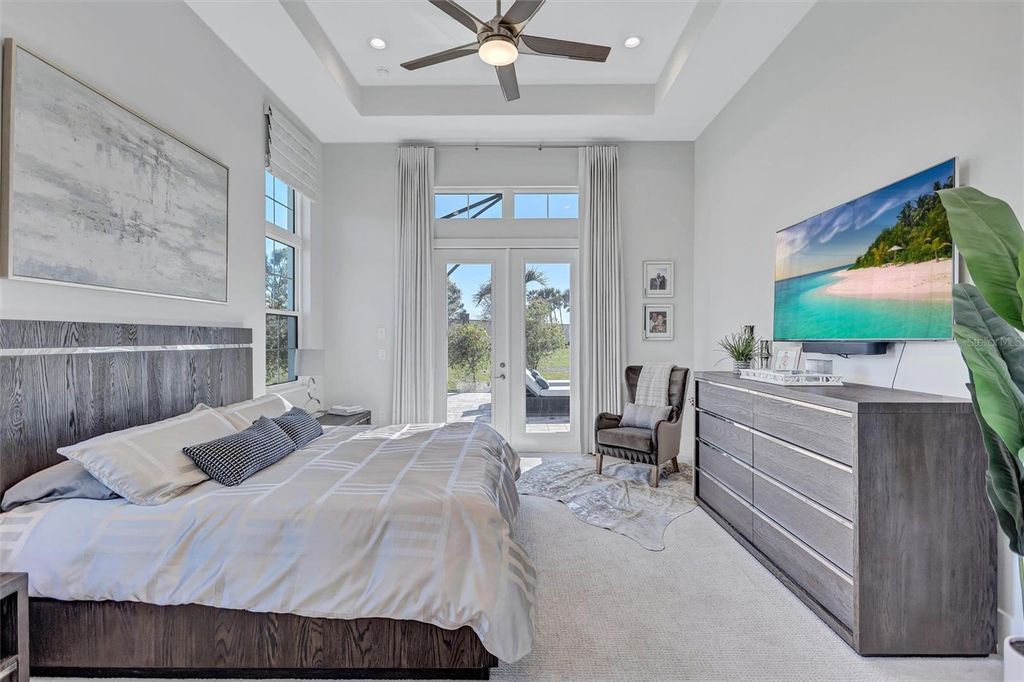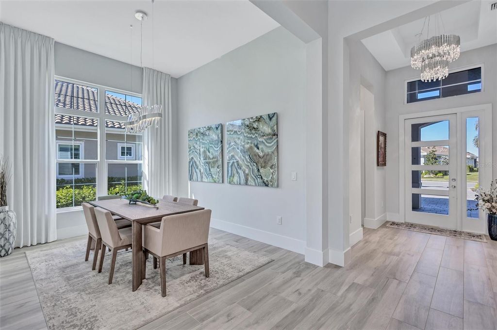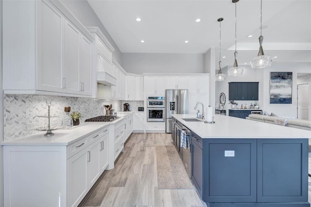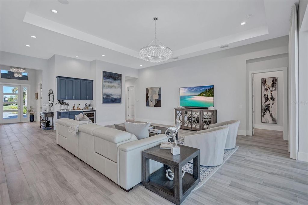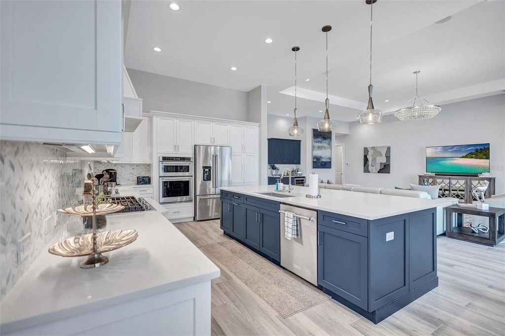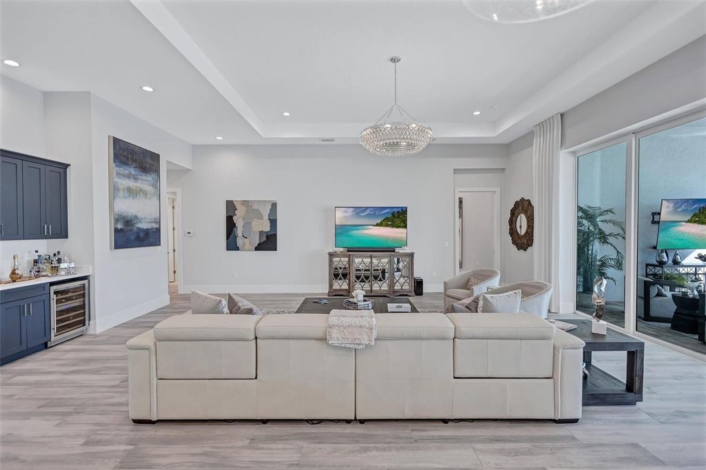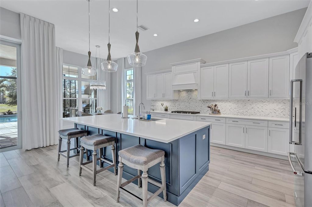 Experience refined Florida living in this beautifully appointed residence within the renowned Lake Club, where comfort, style, and thoughtful design come together in one of Lakewood Ranch’s most sought-after communities. Ideally positioned on a premium water-view homesite, this 2022-built home captures tranquil pond sunsets from its generously sized covered lanai, complete with an expansive, panoramic screened enclosure, finished ceilings, and a fully equipped summer kitchen. Spanning just under 3,000 square feet, the home features an open-concept great room enhanced by soaring ceilings and elegant porcelain plank tile flooring throughout the main living areas. The chef’s kitchen is both functional and stylish, complete with quartz countertops, soft-close cabinetry with pull-out shelving, and a suite of stainless steel appliances, including a gas cooktop and convection oven. Thoughtful enhancements include professionally installed landscape lighting in both the front and rear of the home, as well as a custom outdoor kitchen and smart home upgrades, including a fully automated AV system. Additional interior features include impact-rated windows and doors and upgraded lighting throughout, creating a polished, move-in-ready environment. The spacious primary suite offers a relaxing retreat with a spa-inspired bathroom featuring dual vanities, a walk-in shower, and a freestanding soaking tub. Step outside to your own private outdoor oasis, highlighted by a heated saltwater pool and spa, a generously sized covered lanai with finished ceilings, and a fully equipped summer kitchen—perfect for entertaining or simply enjoying the serene water views. The three-car garage offers ample space and functionality, featuring epoxy flooring and added conveniences such as whole-home surge protection. Located within the gated community of The Lake Club, residents enjoy access to exceptional amenities and are just minutes from Waterside Place, UTC, Main Street Lakewood Ranch, and the area’s renowned Gulf Coast beaches. Situated in an X flood zone, this home offers both peace of mind and an elevated lifestyle in one of the region’s premier locations. Schedule your private showing today and discover all that this exceptional property has to offer.