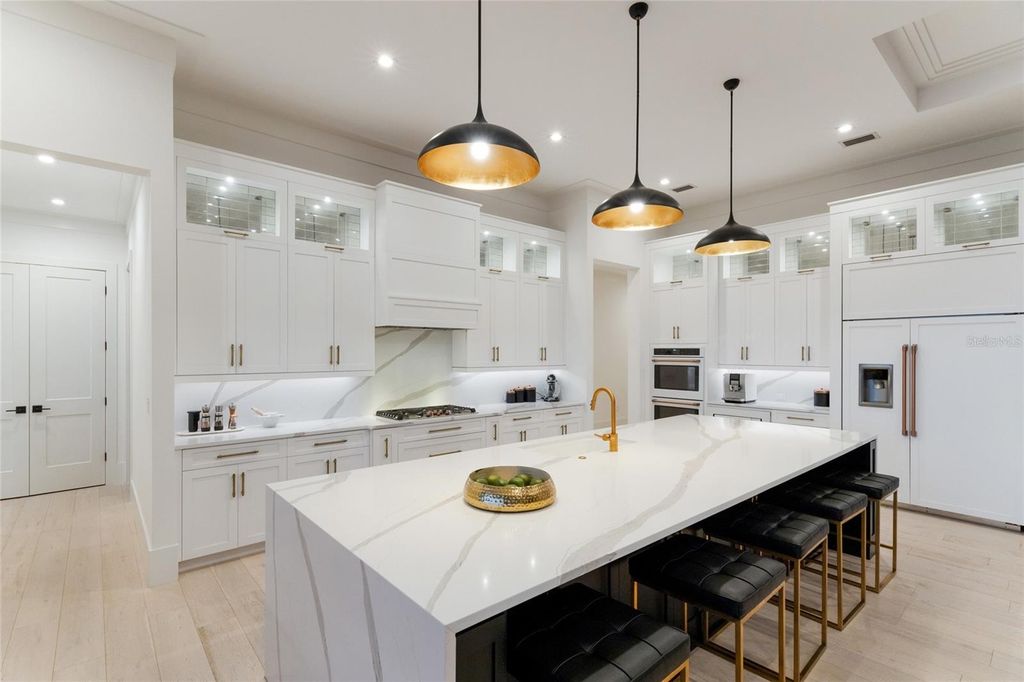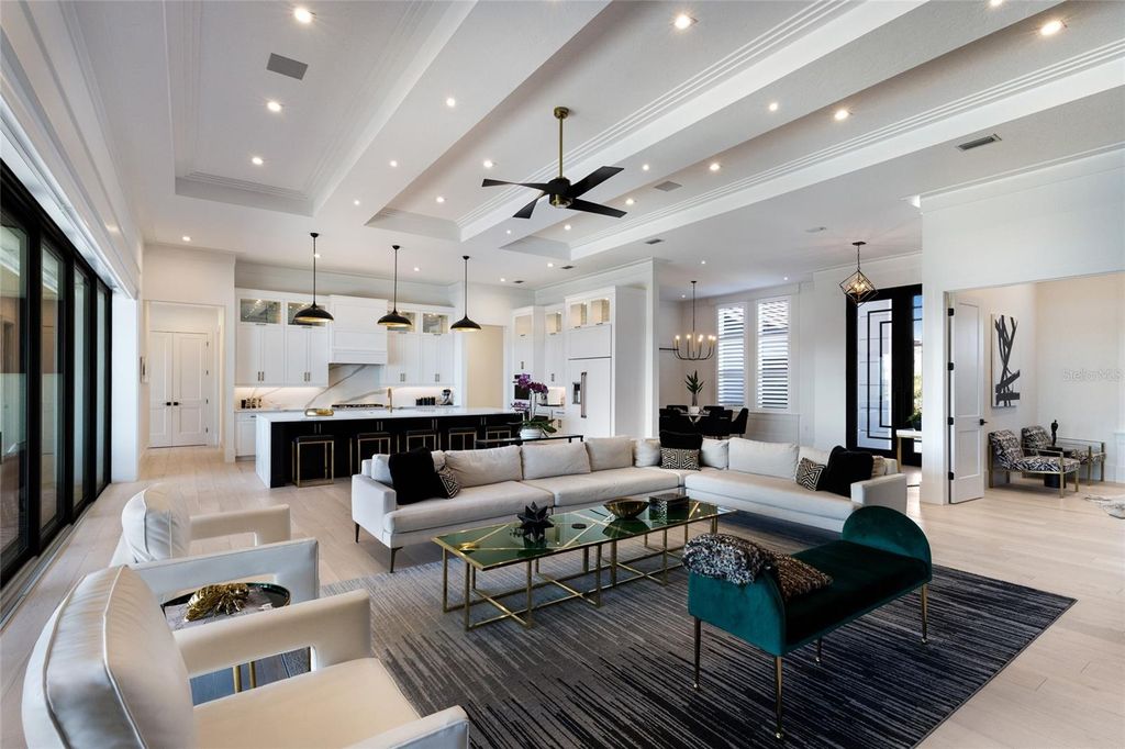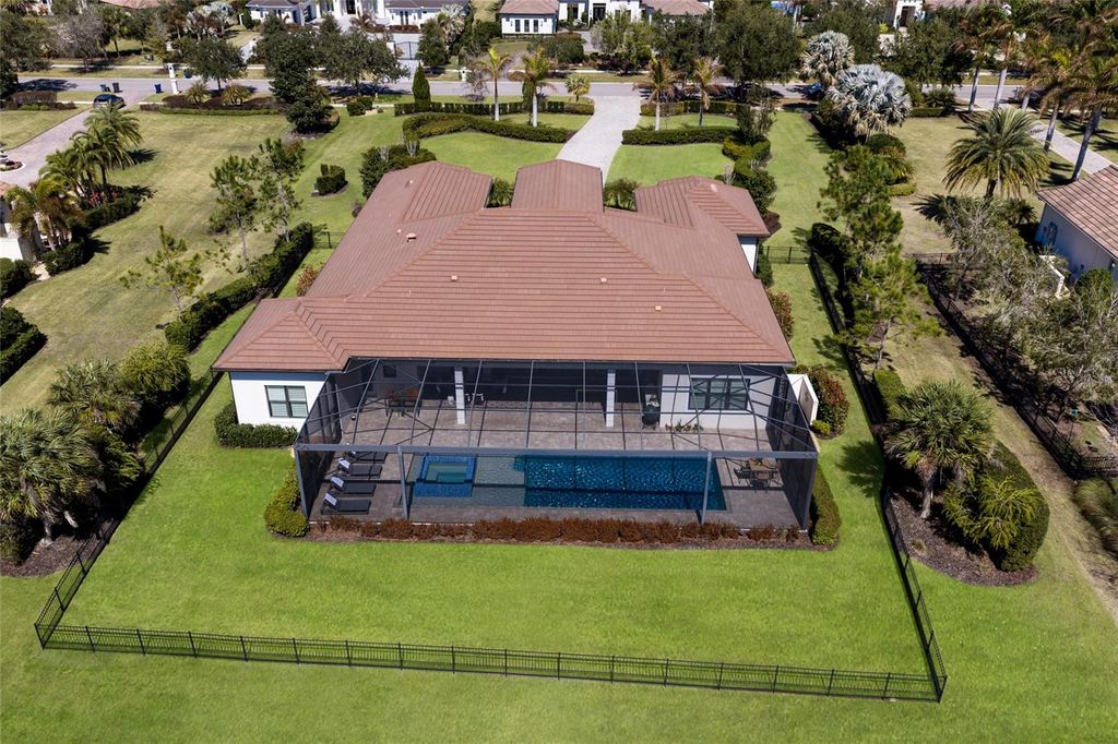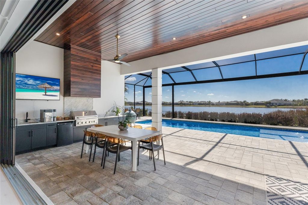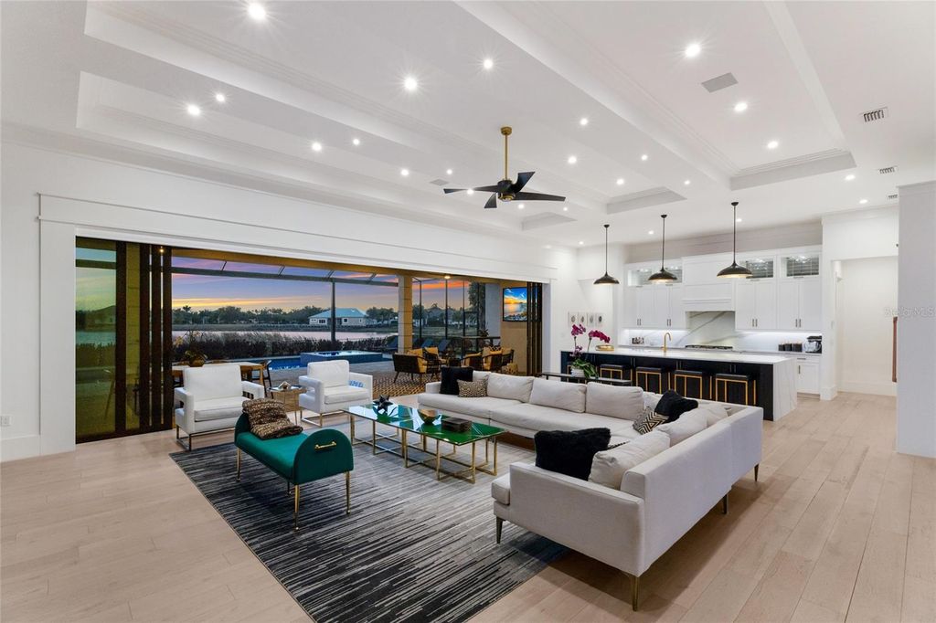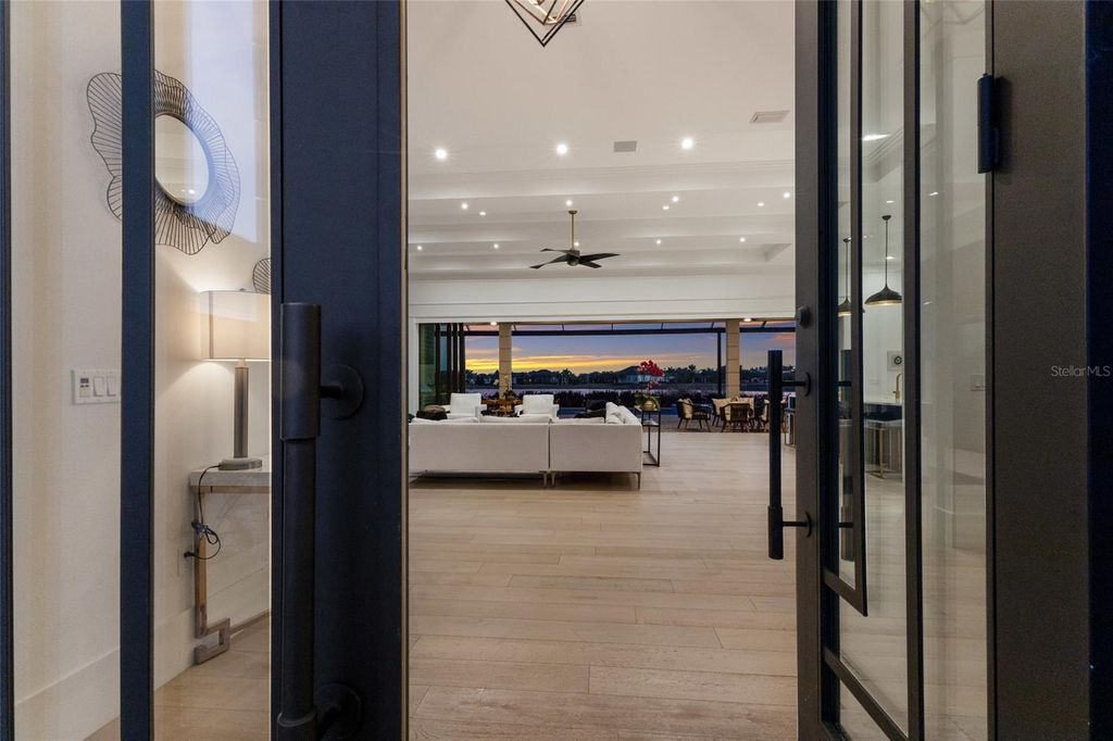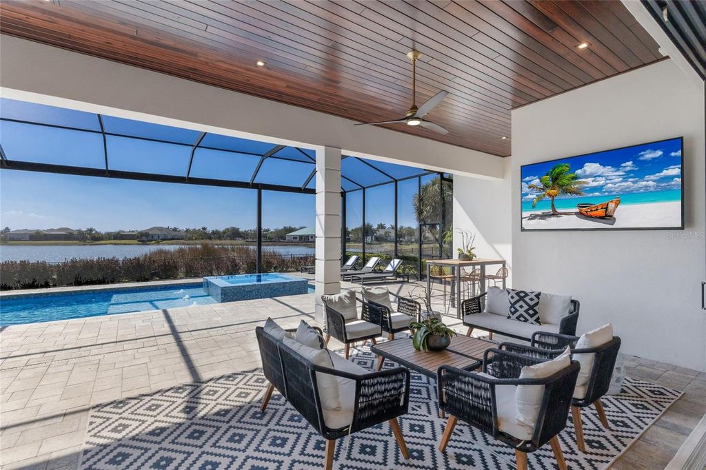 A stately arrival sets the tone for this exceptional custom residence, thoughtfully positioned on over one acre within the gates of The Concession. Blending modern luxury with architectural refinement, the home offers a rare combination of privacy, elegance, and timeless design in one of Lakewood Ranch’s most exclusive communities. Custom double entry doors welcome you into a light-filled interior where engineered hardwood floors anchor the main living spaces and a dramatic wall of sliding glass doors frame serene water views, seamlessly connecting indoor and outdoor living. At the heart of the residence, the chef’s kitchen is both polished and highly functional, appointed with Monogram and Café appliances and anchored by a generous statement quartz island that serves as both focal point and gathering space. Designed to flow effortlessly into the great room and outdoor living areas, the layout supports both elevated entertaining and comfortable everyday living. Architectural elements define the great room, where a custom-designed accent wall showcases intricate detailing, a sleek linear fireplace, and an oversized mounted television, creating a striking focal point that balances warmth with modern design. Tray ceilings throughout further enhance the home’s architectural character, while curated designer lighting, plantation shutters, and a newly installed outdoor surround sound system underscore the thoughtfully executed craftsmanship. The primary suite offers a private retreat of generous proportions, complete with a sitting area and dual custom walk-in closets. The spa-inspired bath features expansive dual vanities, a soaking tub, and a dramatic walk-through shower with triple shower heads, including an overhead rain feature delivering a resort-caliber experience. Two additional guest suites each offer beautifully appointed en-suite baths with elevated design selections tailored for today’s discerning buyer. A private office with oversized windows invites abundant natural light, while the formal dining room is enhanced by a dramatic wine display that serves as a striking focal point for elegant entertaining. A spacious bonus room provides flexible space for recreation, media, or additional guest accommodations. Outdoors, the experience continues with a large pool and spa, expansive covered lanai, and a nicely appointed outdoor kitchen, creating a true resort-style setting. The five-car garage provides exceptional capacity for the automotive enthusiast and additional storage needs, while a fenced yard allows for secure outdoor enjoyment. Constructed with hurricane impact doors and windows throughout and supported by a whole-house generator, the home offers peace of mind with uncompromising quality. This residence masterfully blends functionality with a refined, designer-forward aesthetic, delivering privacy, security, and elevated living. Located just minutes from UTC, Waterside dining and shopping, and the Gulf Coast’s renowned beaches, it offers proximity to everything while maintaining an atmosphere of serene exclusivity. A distinguished offering for those seeking elevated luxury and the true Concession lifestyle.